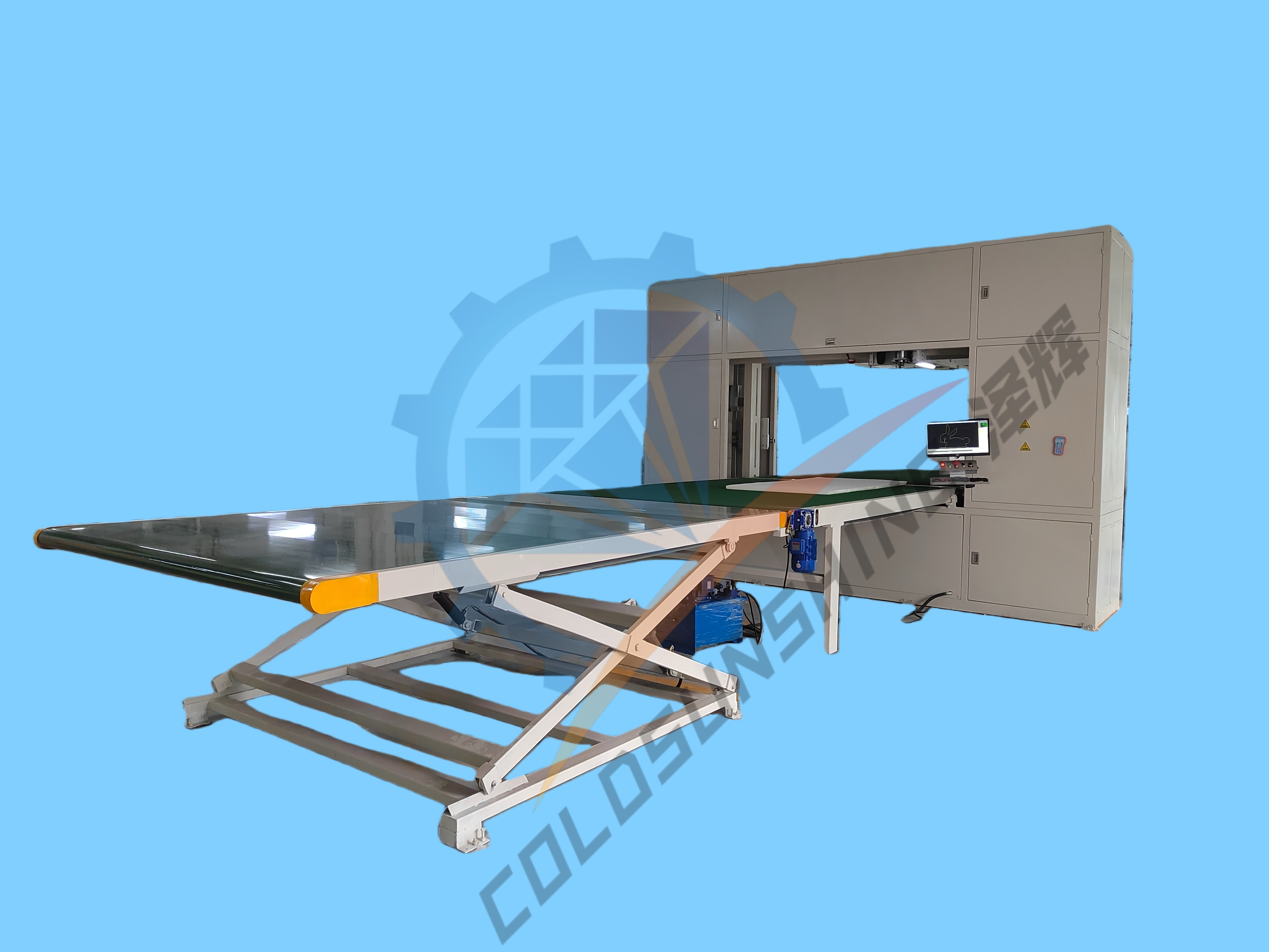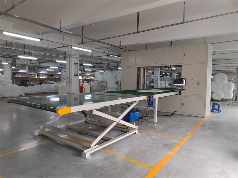 同时前后各配备 1 个液压升降平台(规格长 3000× 宽 2100mm),可根据海绵原料厚度与操作人员身高灵活调节平台高度,方便原料上下料与设备操作,减少人工搬运强度,提升整体加工效率;